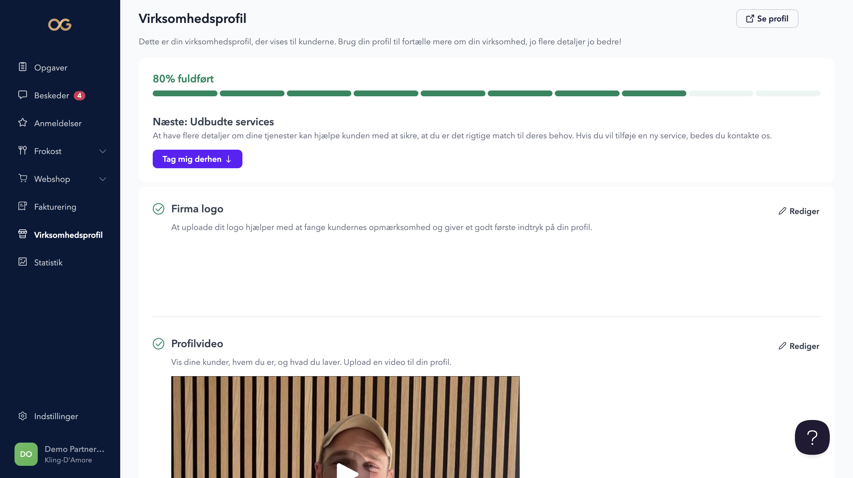 Log ind på din Officeguru og klik på 'Virksomhedsprofil'. Øverst ser du, hvor mange procent af profilen, der er udfyldt. Målet er naturligvis 100%, hvilket indikerer en komplet og informativ profil. Dette ses også ved, at alle fluebenene ved de forskellige sektioner er grønne. Husk altid at trykke Gem efter, du har foretaget ændring på din profil.
