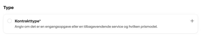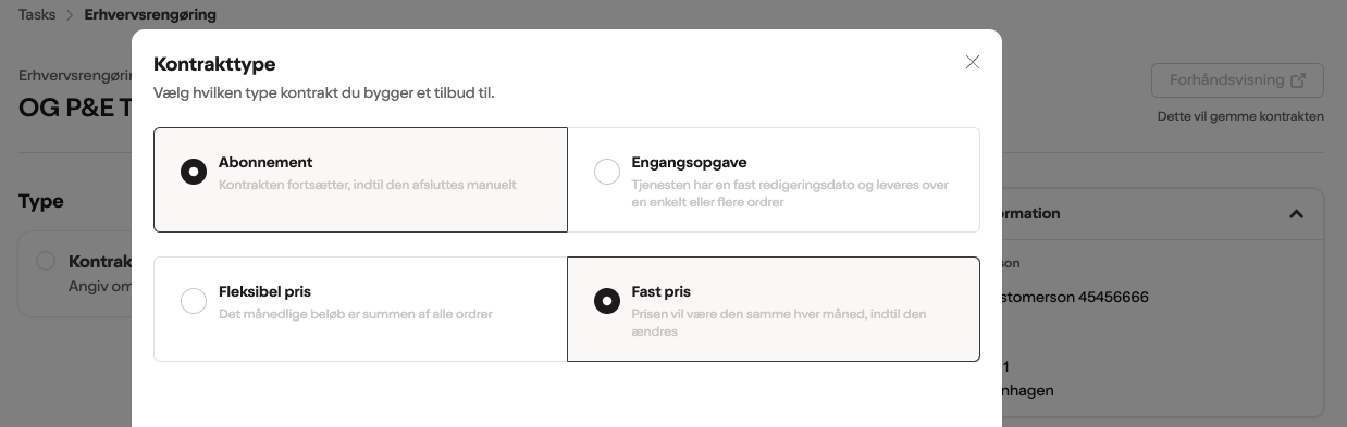 Du skal nu vælge, hvilken af de to typer, der passer til den service, du giver tilbud på. Typisk bruges Abonnement til services, som er løbende, såsom frokostordning, planteservice, rengøring eller kaffeløsning. Engangsopgave er derimod services, som kunden bruger en enkelt gang. Det kan for eksempel være VVS'er, piccolineservice eller flytning.