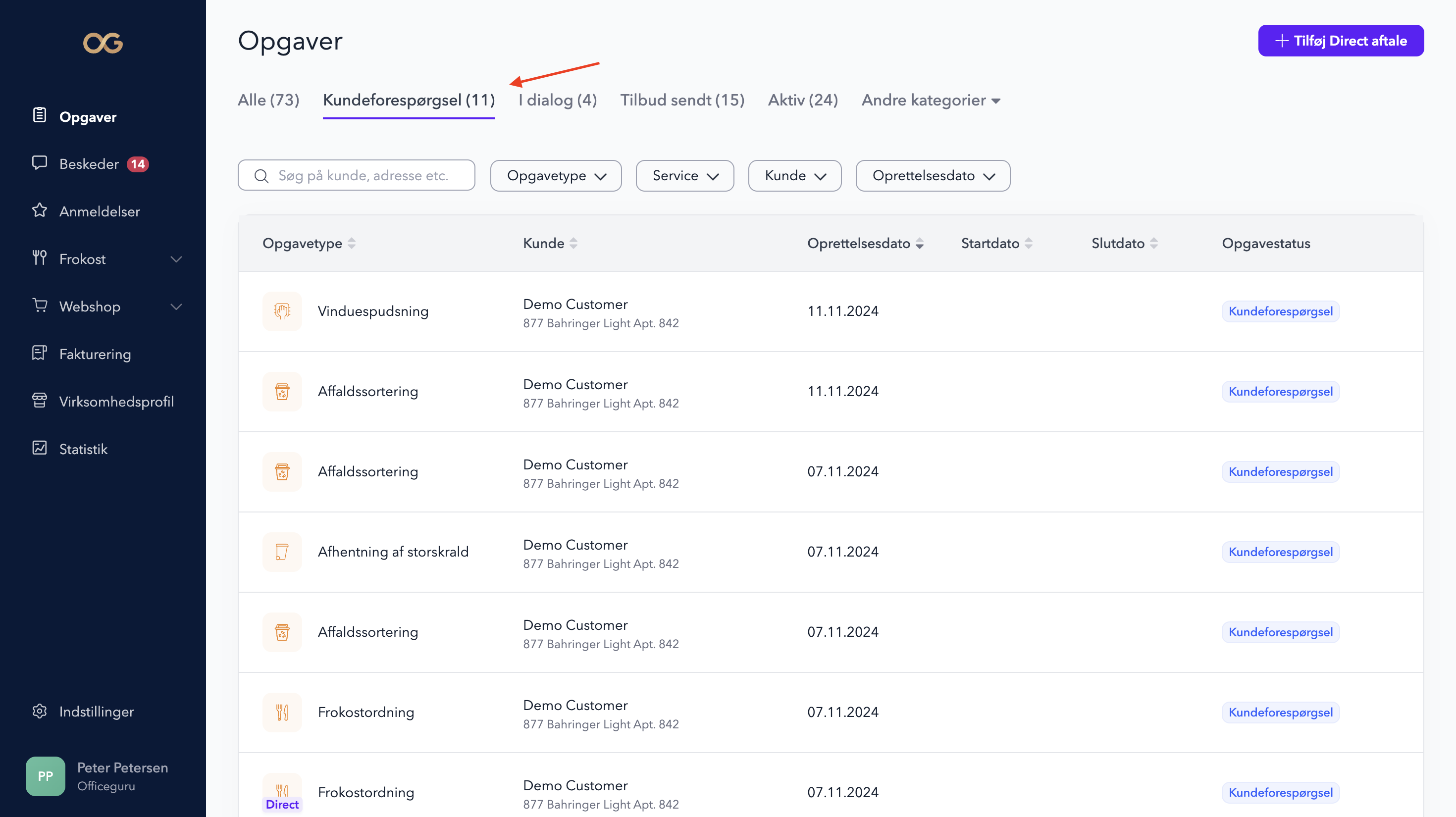Er du i tvivl om hvor du finder kundeforespørgsel kan du følge de her trin: Gå til menuen Opgaver -> klik Kundeforspørgsler -> vælg den opgave, du ønsker at afgive tilbud på -> klik Opret tilbud.