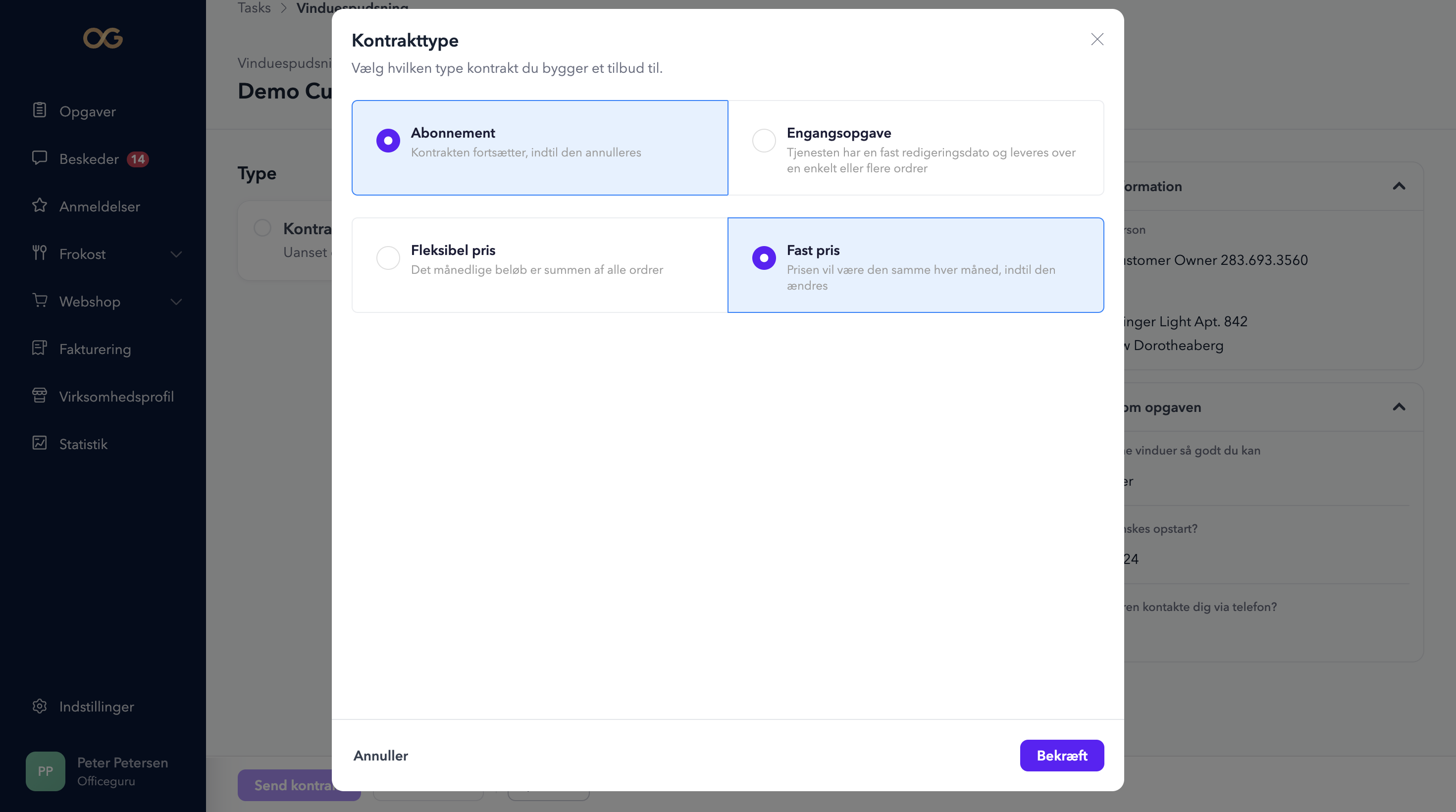 Når du har åbnet kundeforespørgslen, kan du oprette en kontrakt til kunden, der matcher deres behov. Det første, du skal tage stilling til, er, hvilken kontrakttype du vil bruge. Her kan du vælge mellem abonnement med fleksibel eller fast pris eller engangsydelse. Du kan læse mere om, hvilken kontrakttype der passer til dit behov. her.